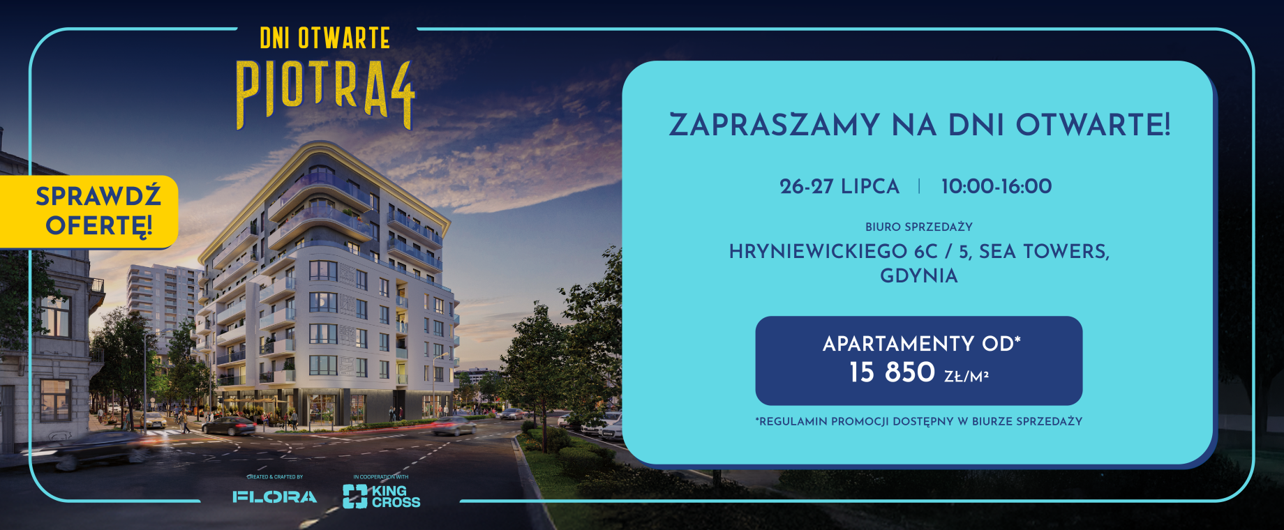 Nasz projekt osiągnął już prawie docelową wysokość – z tej okazji zapraszamy na trzecią edycję Dni Otwartych Piotra 4, na której poznasz ofertę wyjątkowych apartamentów z widokiem na morze i złowisz specjalną okazję na starannie wyselekcjonowane lokale*.